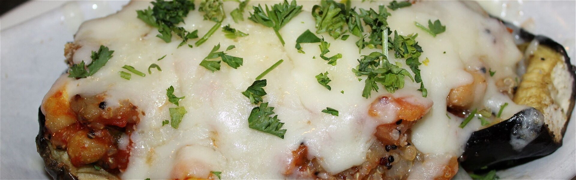 stuffed eggplant roasted eggplant, zucchini, portobello mushrooms, spinach, cpuscous, marinara sauce, melted mozzarella $22